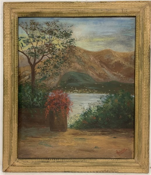 "Paesaggio lacustre" olio su compensato (cm 75x62) Firmato in basso a destra. In cornice