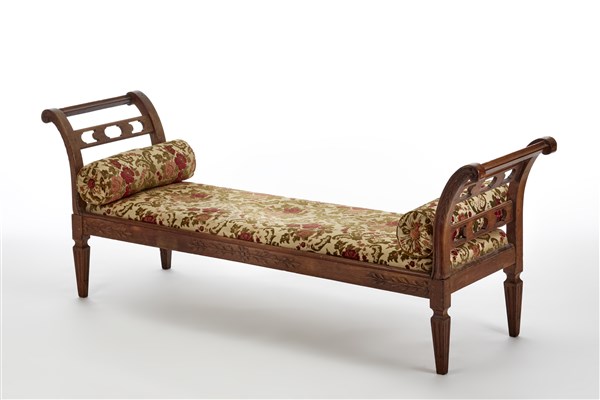 Panca in legno intagliato a motivi fogliacei con braccioli a giorno, seduta e cuscini in tessuto operato. Seconda metà secolo XVIII. (cm 204x77x56) (difetti e restauri)