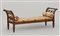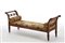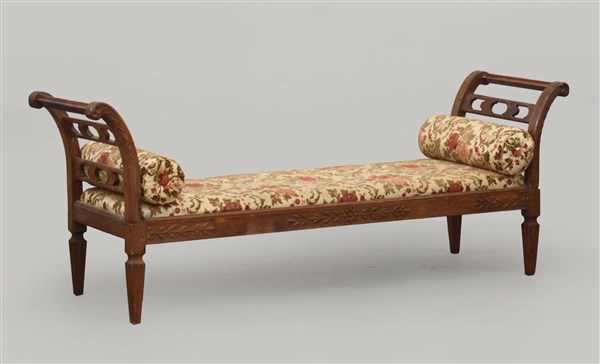 Panca stile Novecento. Milano, anni '20. Legno massello intagliato, rivestimento in tessuto trapuntato a fiori. (cm 204x77x56) (difetti)
