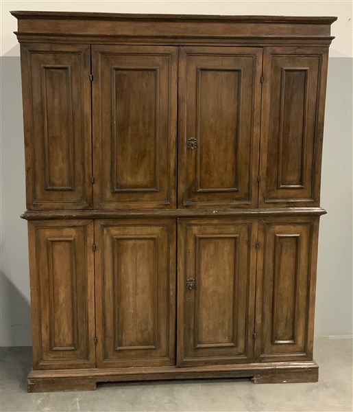 Antico mobile da sacrestia a due corpi a quattro ante con fronte e fianchi pannellati. Piedi a mensola (cm 184x228x 62) (difetti)