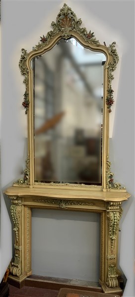 Camino con specchiera di forma sagomata in legno laccato a fondo avorio ed in policromia, scolpito a volute vegetali, conchiglia stilizzata e fiori. Camino (cm 177x133x42), specchiera (cm 250x140) (difetti e mancanze)