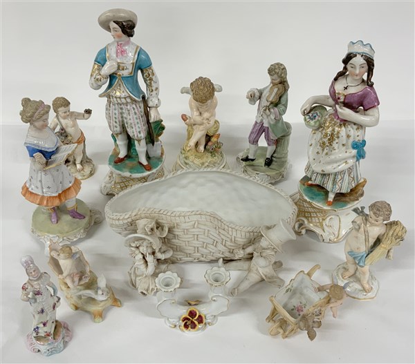 Lotto composto da dodici gruppi in porcellana policroma e biscuit. Alcuni marchiati Meissen, raffiguranti angeli, epoche diverse (difetti e mancanze)