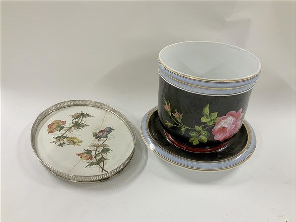 Lotto composto da un vassoio in ceramica decorato a fiori e con ghiera, un vaso con sottovaso in ceramica smaltata sottovetrina su fondo nero decorata a fiori. Italia, secolo XX. (difetti e restauri)