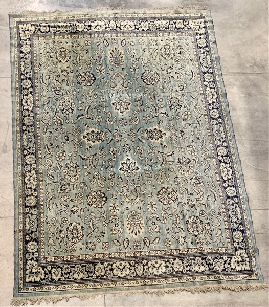 Tappeto meccanico in lana con decoro all over blu su fondo azzurro, secolo XX. (cm 340x235) (Difetti e strappi)