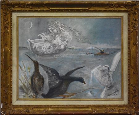 Tita Dondelli "La caccia" 1952 olio su tela applicata su tavola, cm 40x50 cm 39x
