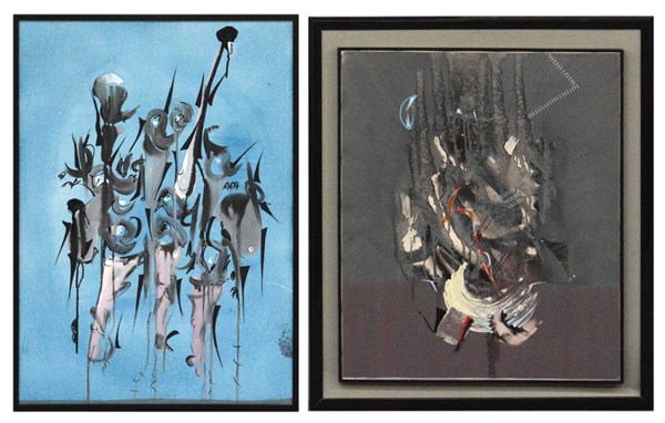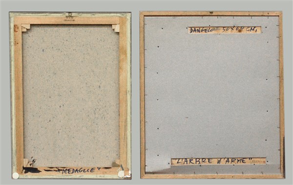 Lotto di due opere: "Medaglie" olio su tela, cm 70x50, firmato in basso al centro; titolato al retro. "L'arbre d'arme" olio su tela, cm 60x50, firmato in basso al centro; firmato e titolato al retro