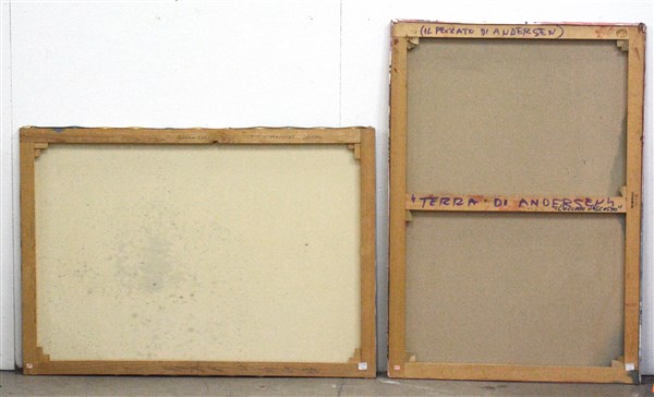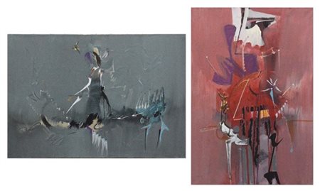 Sergio Dangelo Lotto di due opere: "Casa di mantide" olio su tela, cm 70x100 fir