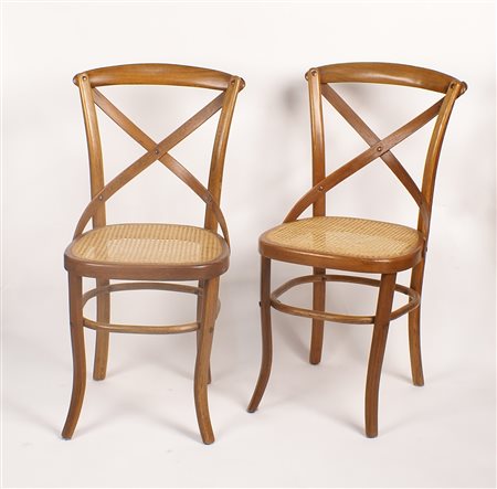 SEI SEDIE DA BISTROT Francia anni 20/30 in mogano, schienale a giorno con seduta in paglia di Vienna h. 91 cm.