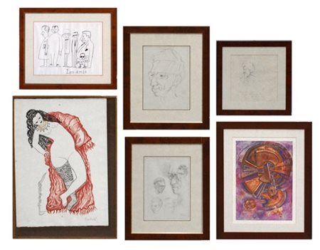 Lotto di 6 opere: 4 disegni su carta raffiguranti ritratti e figure di autori diversi, due dei quali di Enzo Brunori unite a due litografie a colori di autori e soggetti diversi, una di Raphael Mafai