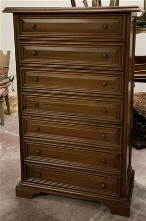 Settimanale in legno con cassetti pannellati e piedi a mensola (cm 84x132x44) (
