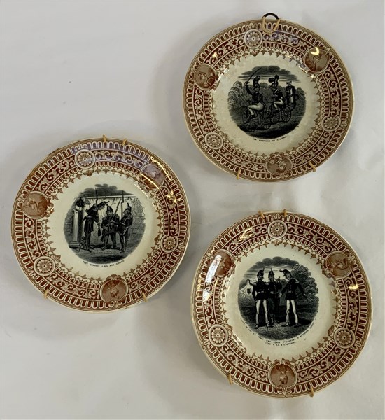 Manifattura di Sarreguemines, gruppo di tre piatti in ceramica smaltata e stampata a raffigurare scene umoristiche di militari e pompieri. Francia, ultimo quarto del secolo XIX (d. cm 20) (lievi difetti)