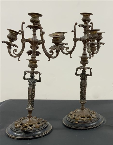 Coppia di candelieri in metallo cesellato a quattro fiamme fusto a forma femminile a tutto tondo poggianti su base in legno ebanizzato (h cm 36) (difetti)