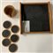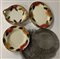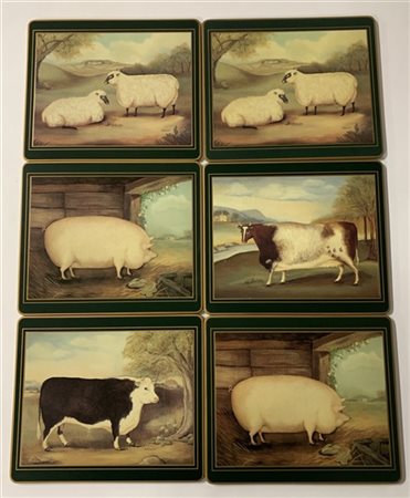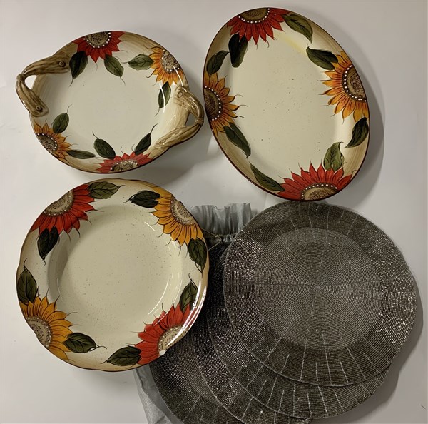 Manifatture diverse. Lotto composto da tre piatti da portata ed un centrotavola decorati a fiori in ceramica, un vassoio con sei sottobicchieri in legno e ardesia, quattro sottopiatti argentati ed una serie di sei vassoietti in legno decorati con caricature di animali (difetti)