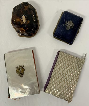 Lotto composto da due agende e due portamonete in madreperla, tartaruga e altri materiali (difetti)