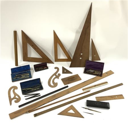 Lotto composto da numerosi strumenti geometrici e di misura, alcuni in custodia