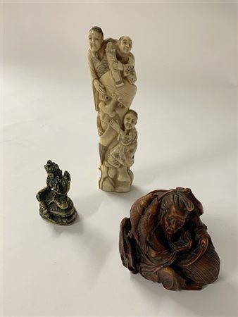 Manifattura orientale. Lotto composto da un okimono in avorio e due sculture di materiali diversi (difetti e mancanze)