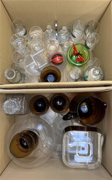 Due cartoni contenenti numerosi oggetti in vetro per la tavola di manifatture d