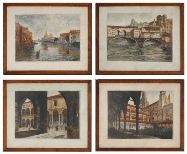 Firma indecifrata "Scorci di citta" gruppo di quattro acquaforte (cm 50x62 il f