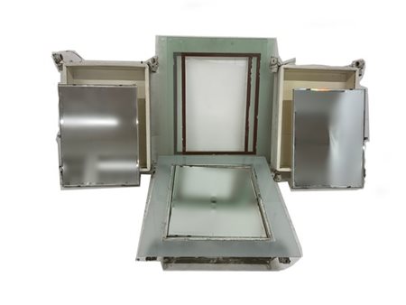 Gruppo di tre mobiletti pensili da bagno in legno laccato bianco, interno a specchio, secolo XX. (difetti)