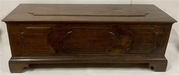 Cassapanca con fronte e piano pannellati, piedi a mensola (cm 170x61x60) (difetti)