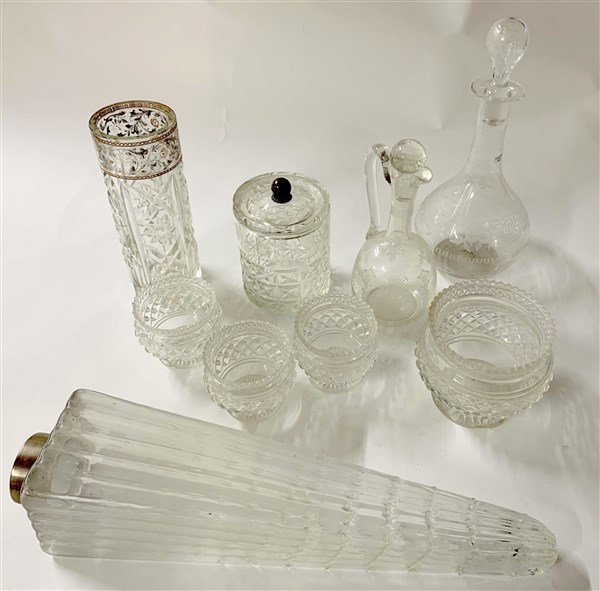 Lotto composto da tre bottiglie con tappo, un vaso, una scatola con coperchio e numerosi oggetti di diverso uso e fattura in cristallo, vetro e metallo argentato (difetti)