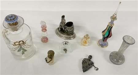 Lotto composto da nove contenitori diversi tra cui portaprofumi in vetro e metallo (difetti)