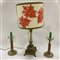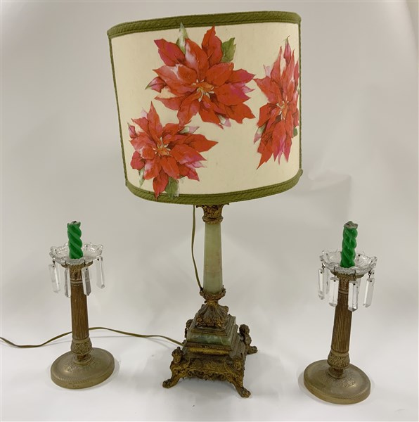 Lotto composto da una base per lampada in metallo dorato con fusto in onice e base decorata a cherubini e una coppia di candelieri in metallo dorato con fusto a colonna scanalata (h. cm 34) (difetti)