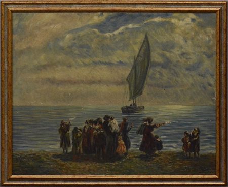 Firma indecifrata "La partenza dei pescatori" 1926, olio su tela (cm 67x83) Firmato e datato in basso a destra. In cornice