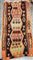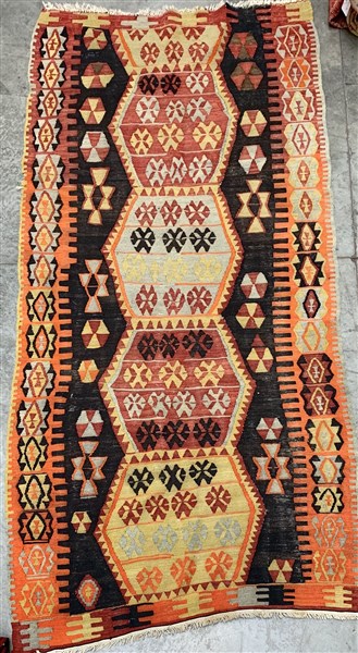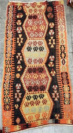 Tappeto Kilim, Anatolia, inizio Secolo XX. Decoro con esagoni in sequenza nei toni dell’azzurro, verde, rosso e marrone su fondo marrone. (Difetti e rapature e mancanze) (cm 235x113)