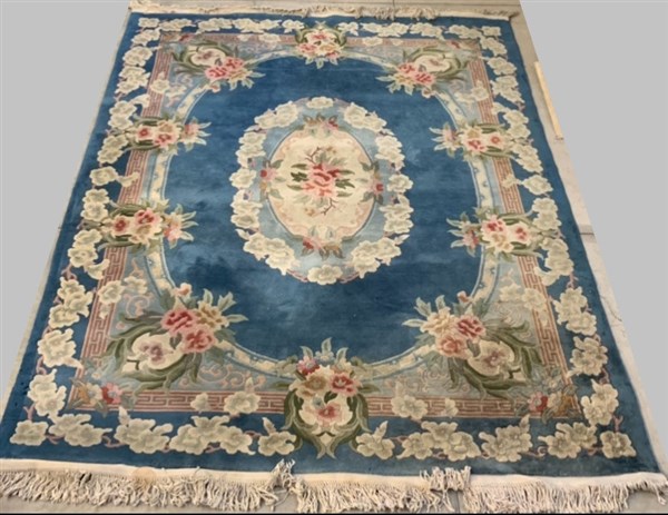 Tappeto cinese annodato con taglio scolpito. Secolo XX. Decoro di ispirazione francese con medaglione floreale su fondo azzurro. (Difetti, mancanze e macchie) (cm 243x182)