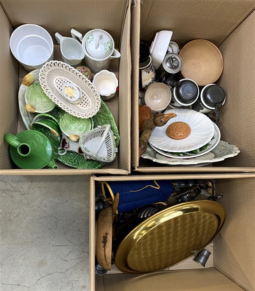 Tre cartoni contenenti numerosi oggetti in ceramica ed altri materiali principalmente per la tavola (difetti)