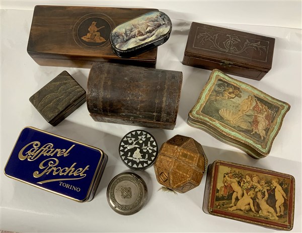 Lotto composto da undici scatole in legno, latta, pelle e altri materiali, di forme diverse (difetti)