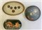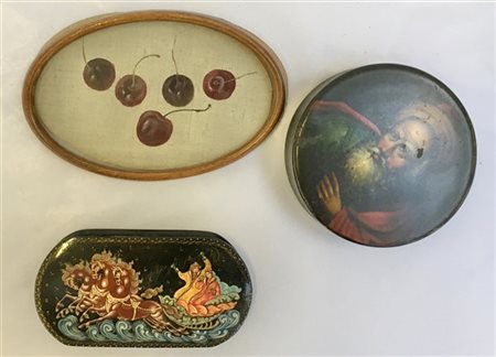 Lotto composto da due scatole russe in lacca dipinta ed un piccolo dipinto con ciliegie (difetti)