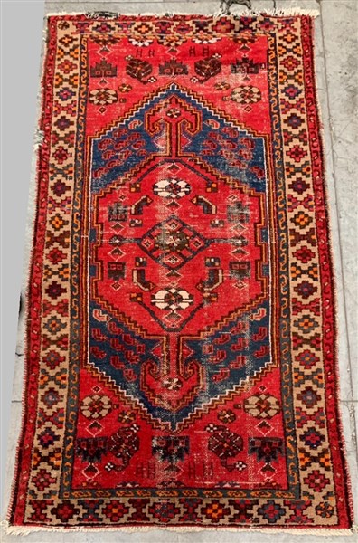 Tappeto Hamadan, Persia, Secolo XX. Decoro con medaglione rosso con puntali su fondo azzurro. (Difetti, rapature, mancanze e strappi) (cm 204x107)