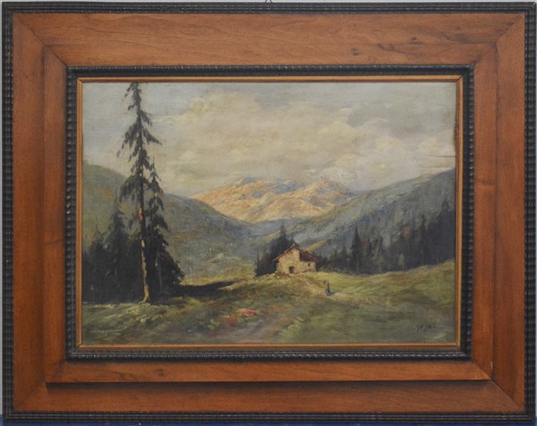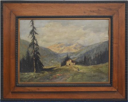 "Paesaggio montano" olio su compensato (cm 50x73) Firmato in basso a destra.