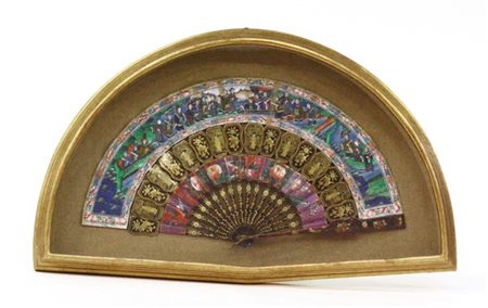 Ventaglio con stecche in legno laccato e pagine in carta dipinta, in bacheca (d