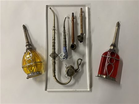 Lotto composto da due piccole bottiglie in vetro e metallo ed una piccola collezione di quattro pipe montate su pannello di plexiglass (difetti)