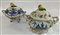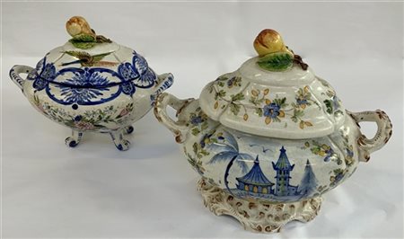 Lotto di due zuppiere biansate in ceramica craquelé dipinte in policromia con e