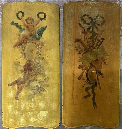 Coppia di pannelli in legno di forma sagomata decorati in policromia su entrambi i lati con strumenti musicali e putti alati (cm 69x31) (difetti)