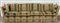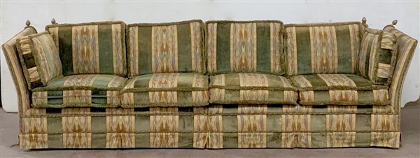 Divano a quattro posti modello "Caccia". Italia, anni '70. Cuscini asportabili e rivestimento a righe in velluto verde e tessuto fiammato, pigne decorative in ottone. (cm 300x86x92) (difetti)