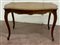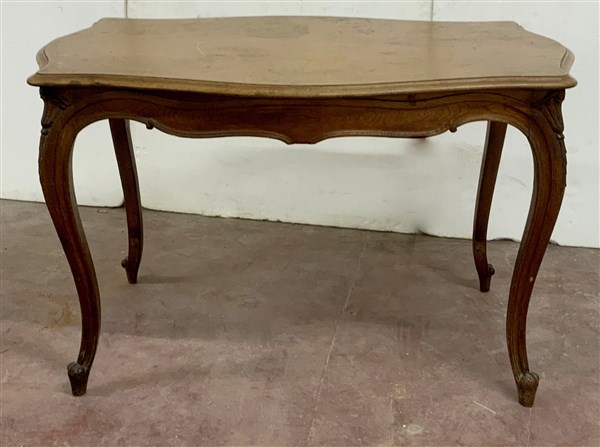 Tavolino da salotto in legno con piano e fascia sagomati, gambe mosse intagliate all'attacco (cm 122x75x73) (difetti)