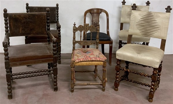 Lotto composto da una coppia di poltroncine con montanti torniti e quattro sedie di fatture ed epoche differenti (difetti)