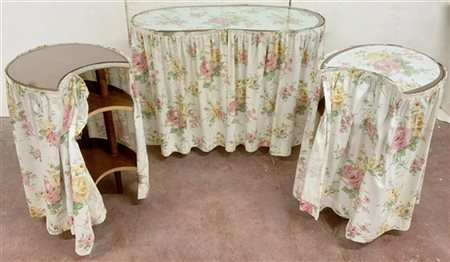 Toilette Habille tripartita con struttura in legno, ripiani in vetro, rivestita con tessuto a fiori (difetti)