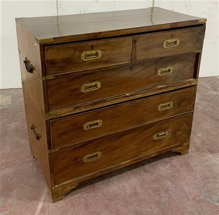 Cassettiera navy a quattro cassetti di cui quello superiore a ribalta con piano a scrittoio, cassettini e vani a giorno, maniglie in ottone. Secolo XX. (cm 102,5x98x50,5) (difetti)