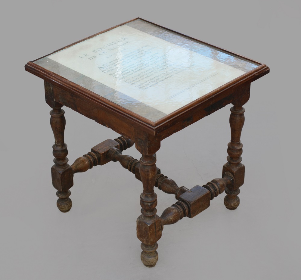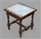 Tavolino da salotto con gambe e traverse tornite, piano decorato con stampa (cm 52x50x45) (difetti)