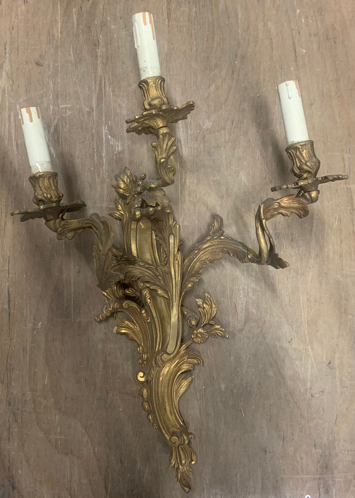 Applique a tre fiamme in bronzo dorato e cesellato a foglie e volute (h cm 56) (difetti)