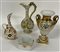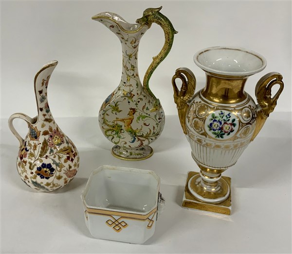 Lotto composto da due versatoi, un vaso e una ciotola in ceramica e porcellana decorati in policromia, di diversa manifattura (difetti)