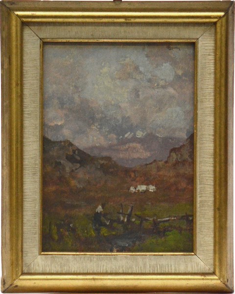 Lorenzo Gignous "Figure in un paesaggio" dipinto ad olio (cm 27.5x20) Firmato in