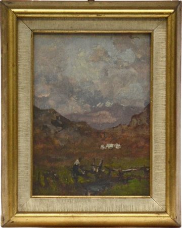 "Figure in un paesaggio" dipinto ad olio (cm 27.5x20) Firmato in alto a destra. In cornice