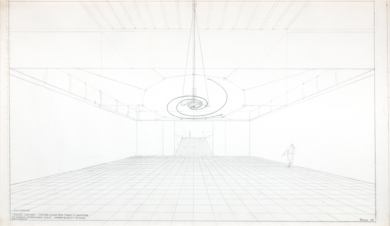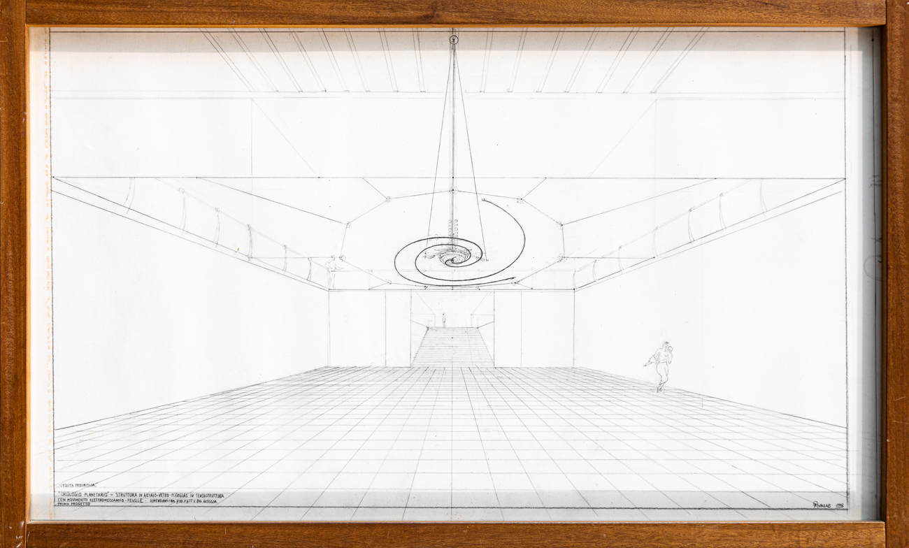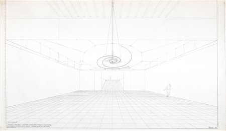 Firma, datazione e iscrizione dell'Artista 'Veduta prospettica. Orologio planetario - struttura in acciaio - vetro - plexiglass in tensostruttura con movimento elettromeccanico - pensile. Dimensioni cm 700x400x800 altezza. Primo progetto' al fronte